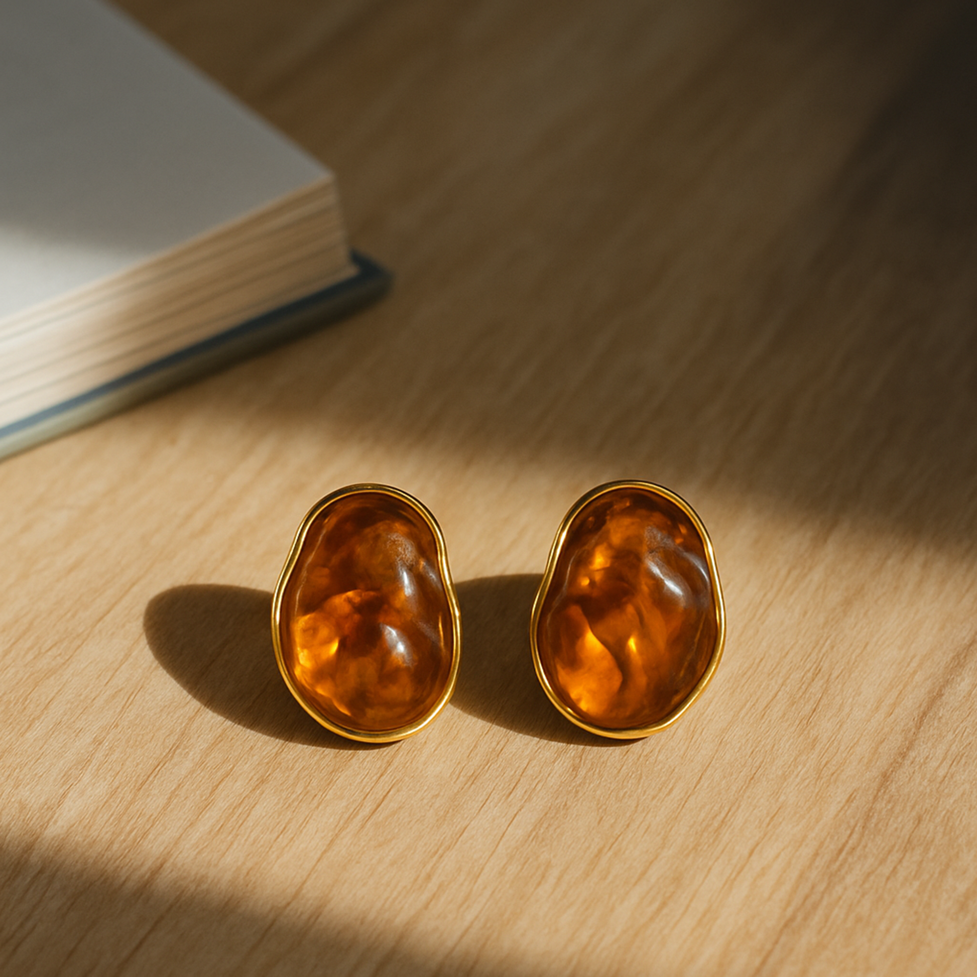 The Golden Ember Pebble Earrings feature a molten amber-style resin center framed by softly sculpted gold-tone metal, creating a vintage, sun-lit look that feels both artistic and timeless.